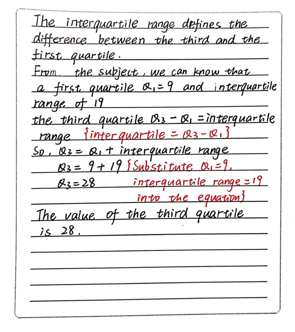 The first quartile (q1) is defined as the middle number between the smallest number (minimum) and the median of the data set. The first quartile, q1 , is the same as the 25 th percentile, and the third quartile, q3 , is the same as the 75 th percentile. The lower outlier boundary is the upper outlier boundary is this problem has been solved! The lower quartile, or first quartile, is denoted as q1 and is the middle number that falls between the smallest value of the dataset and the median. The first quartile is 5 the third quartile is 9 part 2 of 4 (b) find the iqr.